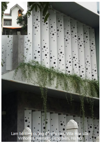 Một số sản phẩm tiêu biểu: 1. Lam bê tông (Facades) trang trí ngoại thất công trình; 2. Tấm ốp lát bê tông cường độ siêu cao, cường độ chịu kéo uốn: 10 - 20 MPa; 3. Bàn ghế bê tông nghệ thuật tối giản Tadao Ando; 4. Chậu cây xi măng composite nhẹ 3 lớp; 5. Gạch lát bê tông tông cường độ cao thay đá tự nhiên; 6. Song chắn rác bê tông cường độ siêu cao, tải trọng giới hạn: 250 kN.